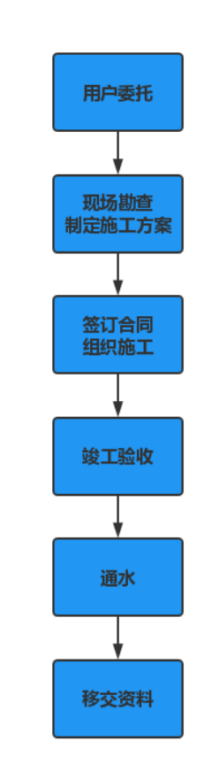 二、用戶委托---建設(shè)工程有限公司現(xiàn)場(chǎng)踏勘---供水施工方案---簽訂合同---建設(shè)工程有限公司組織安全文明施工---竣工第三方驗(yàn)收---通水---移交(供水設(shè)施及技術(shù)檔案)
