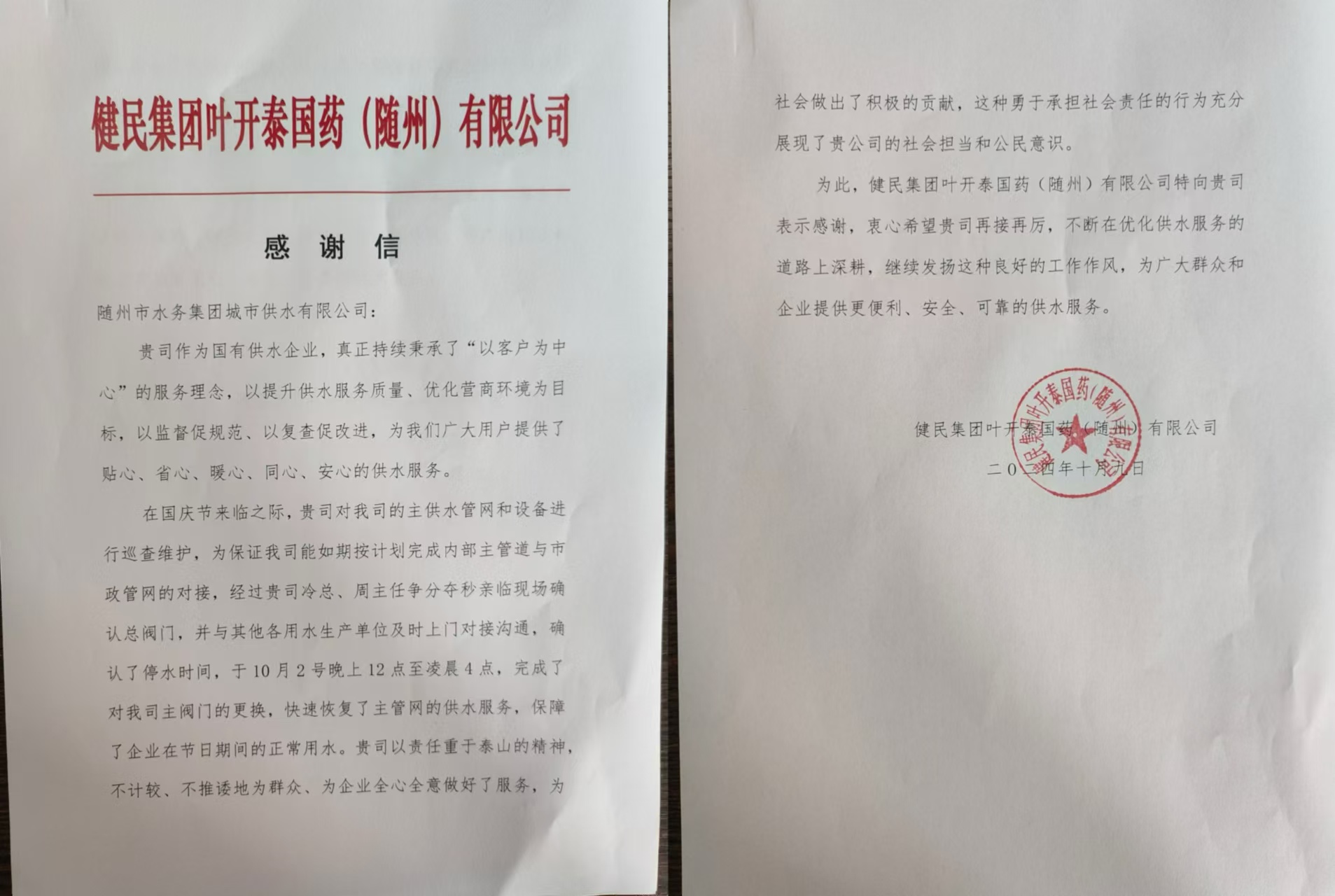 “排憂解難及時(shí) 供水服務(wù)周到”,近日,健民集團(tuán)葉開泰國(guó)藥(隨州)有限公司專程到隨州市水務(wù)集團(tuán)下屬子公司城市供水有限公司送上一面承載誠(chéng)摯謝意的錦旗和一封感謝信,他們用最質(zhì)樸、最真摯的方式,對(duì)公司運(yùn)維人員熱情、高效、便捷、暖心的服務(wù)表示誠(chéng)摯感謝。