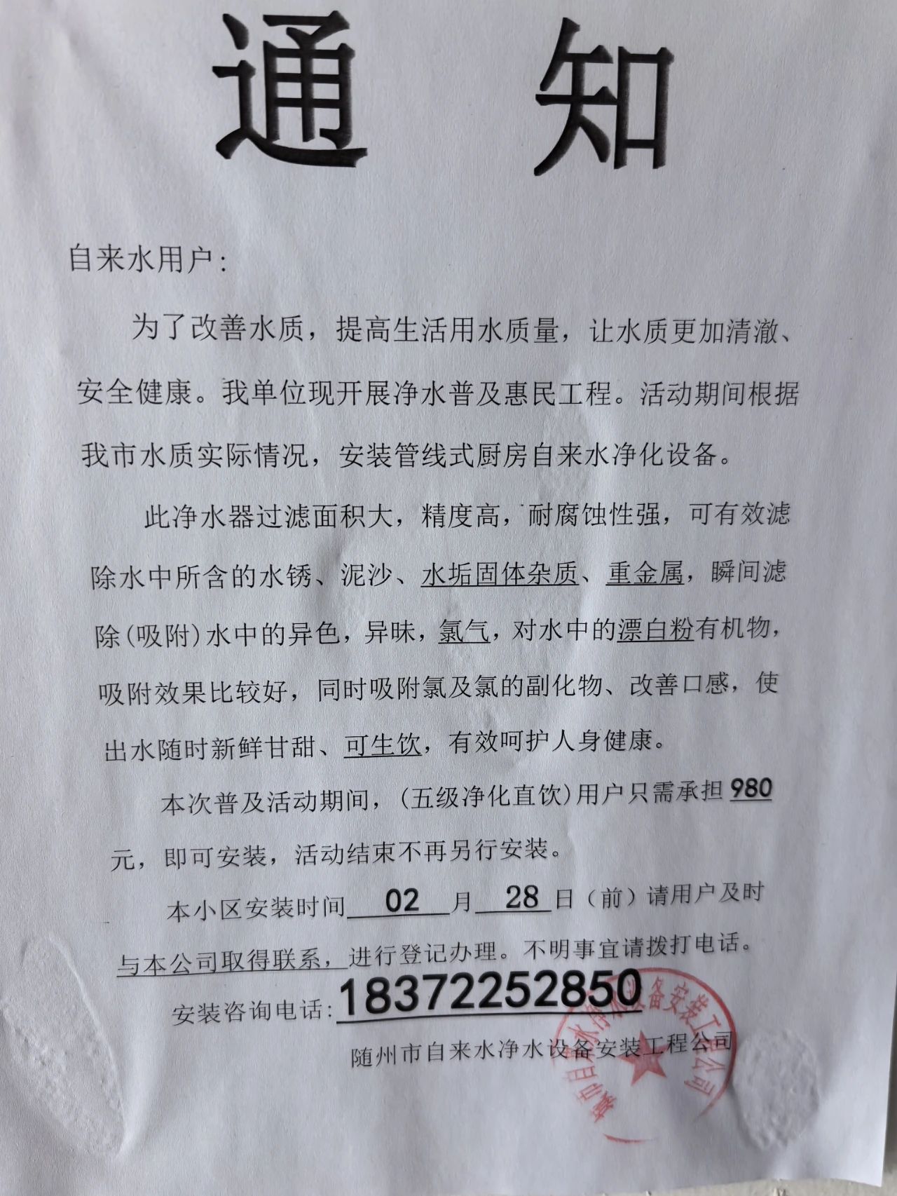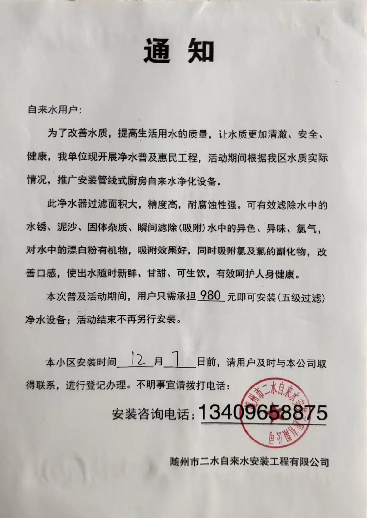 近期,我公司在隨州城區(qū)多個小區(qū)發(fā)現(xiàn)以“隨州市自來水凈水設(shè)備安裝工程公司”“隨州市二水自來水安裝工程有限公司”等公司名義張貼的《通知》。該行為打著改善自來水水質(zhì)的幌子,誤導(dǎo)自來水用戶,推銷凈水設(shè)備,已造成惡劣影響?,F(xiàn)為維護(hù)我公司和廣大市民的合法權(quán)益,特鄭重聲明如下: