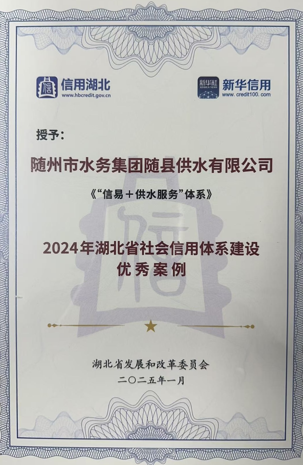 在2024年湖北省社會信用體系建設(shè)典型案例評選中,隨州市水務(wù)集團(tuán)有限公司憑借創(chuàng)新實(shí)踐項(xiàng)目《“信易+供水服務(wù)”體系》,成功榮膺全省優(yōu)秀案例獎。這一殊榮既是對隨州水務(wù)集團(tuán)創(chuàng)新服務(wù)成效的認(rèn)可,更是為社會信用建設(shè)和營商環(huán)境優(yōu)化注入強(qiáng)勁動能,進(jìn)一步激活創(chuàng)新發(fā)展新勢能。