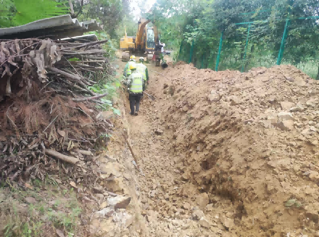 機電學校DN250球墨管供水工程線路處于山地丘陵地帶,沿線涉及鄉(xiāng)村道路、開墾菜園、陡峭山體等多重地質和復雜環(huán)境考驗。在沿機電學校圍墻邊緣鋪設段,鄉(xiāng)村道路與圍墻之間不足3米的狹窄空間,成為施工線路上的“攔路虎”,該道路是周邊居民日常出行的主要通道,一旦長時間阻斷,將嚴重影響群眾生活。項目部與學校和村委共同研討下,最終確定利用2天時間,集中突擊,調用多臺設備,全力沖刺,快速施工完成后復路于民,順利啃下硬骨頭。