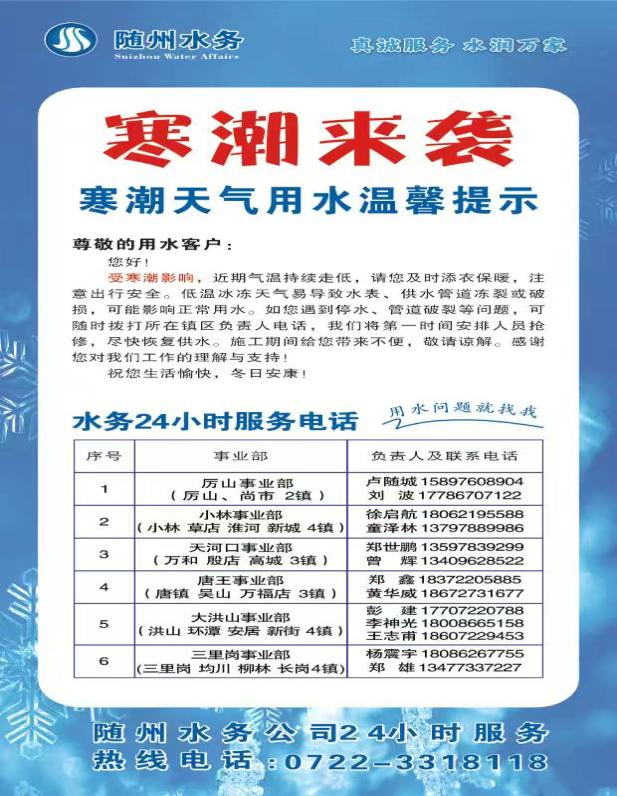 近期,我市持續(xù)遭遇低溫寒潮,嚴(yán)寒天氣對城鄉(xiāng)供水管網(wǎng)及設(shè)施構(gòu)成嚴(yán)峻挑戰(zhàn),水務(wù)集團隨縣供水公司迅速激活應(yīng)急響應(yīng)機制,提前部署筑防線、精準(zhǔn)服務(wù)解民憂、全員堅守保暢通的硬核舉措,切實保障居民冬季用水無憂。